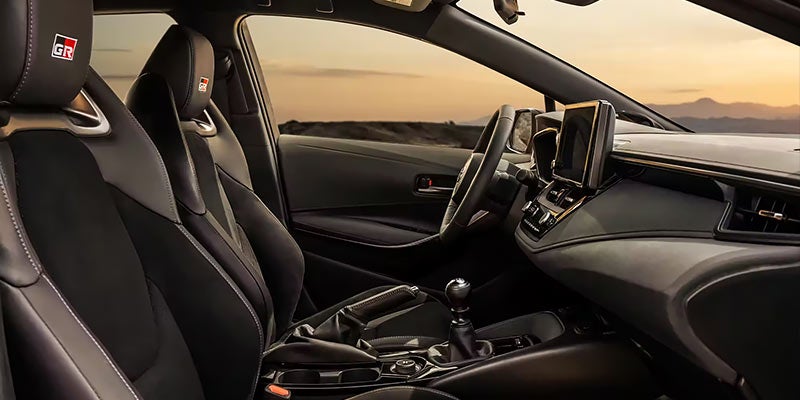 Even at a standstill, GR Corolla looks like it’s ready for action. Flared front and rear fenders show off its wider stance for better grip of the road, while sporty black accents combine form and function. Its available red-painted calipers and GR badging hint that it’s more than just good looks.