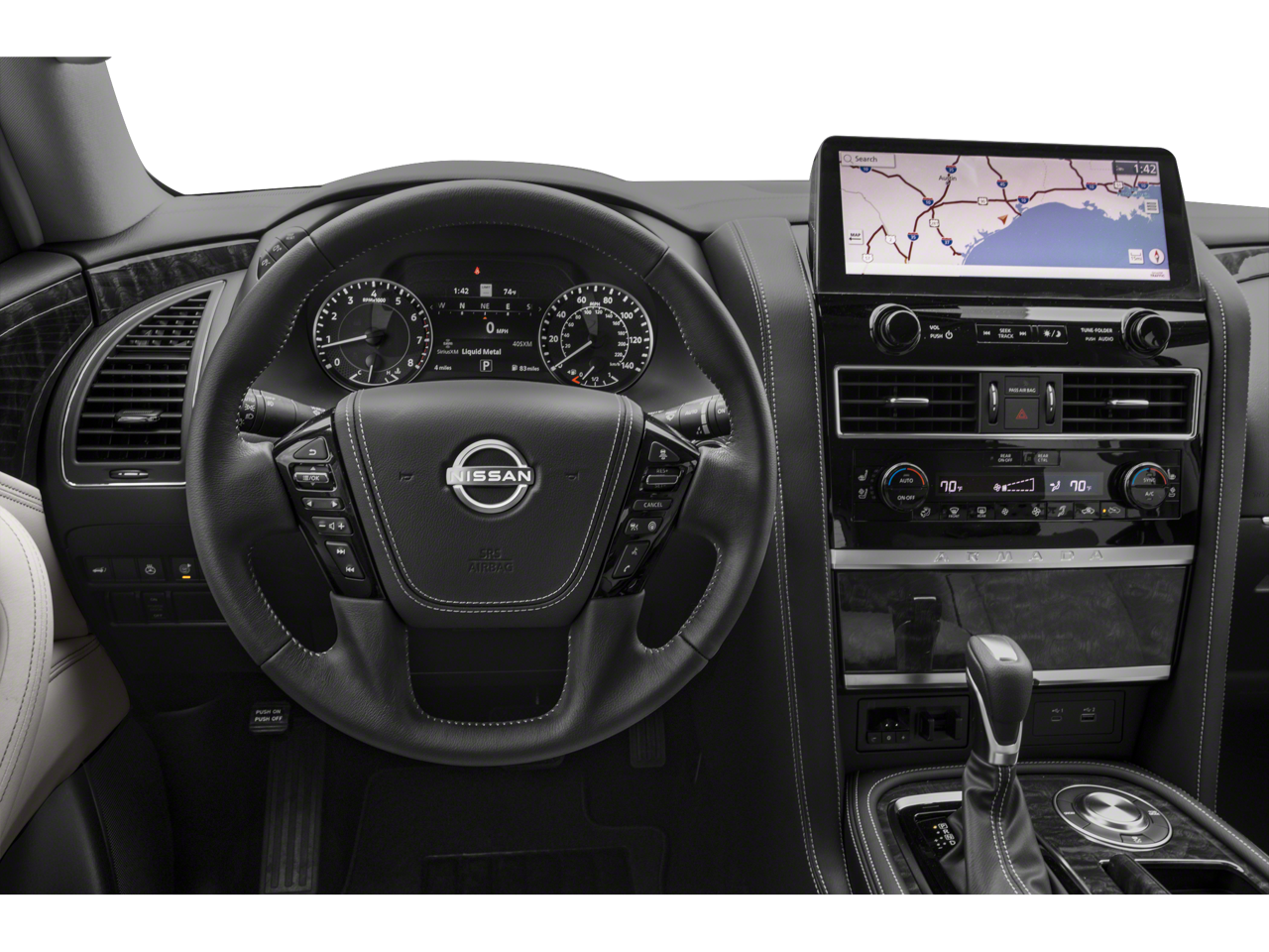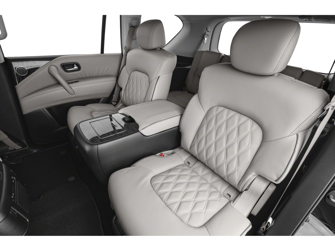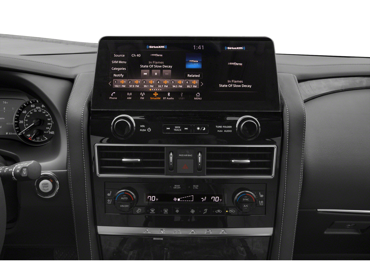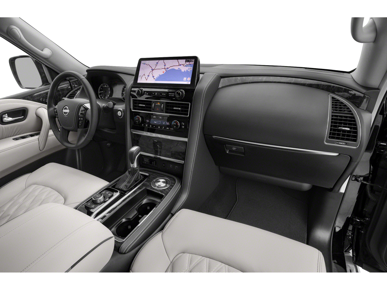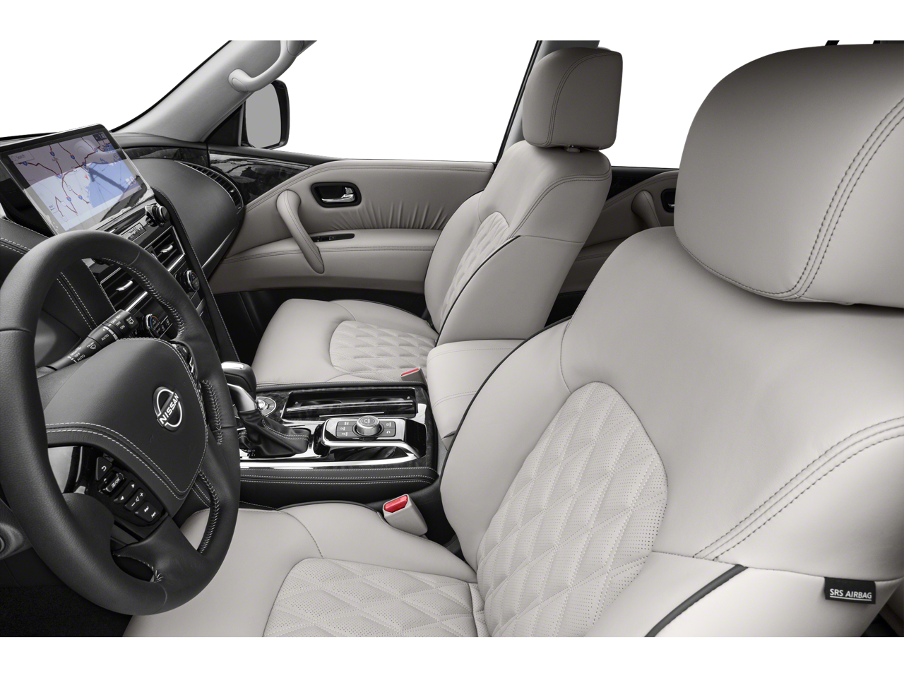 13 Speakers, 2.94 Axle Ratio, 2nd Row Captain's Chairs, 2nd Row Center Console w/Padded Armrest, 3rd Row Carpeted Floor Mats - Captain Seat, 3rd row seats: split-bench, 4-Wheel Disc Brakes, A/V remote, ABS brakes, Air Conditioning, Alloy wheels, AM/FM radio: SiriusXM, Anti-whiplash front head restraints, Auto High-beam Headlights, Auto tilt-away steering wheel, Auto-dimming door mirrors, Auto-dimming Rear-View mirror, Auto-leveling suspension, Automatic temperature control, Bose 13-Speaker Premium Audio System, Brake assist, Bumpers: body-color, Captain's Chairs Package, Cargo Package, Climate-Controlled Front Bucket Seats, Cross Bars, Delay-off headlights, Driver door bin, Driver vanity mirror, Dual front impact airbags, Dual front side impact airbags, Electronic Stability Control, Emergency communication system: NissanConnect Services, Exterior Parking Camera Rear, Four wheel independent suspension, Front anti-roll bar, Front Bucket Seats, Front Center Armrest, Front dual zone A/C, Front fog lights, Front reading lights, Fully automatic headlights, Garage door transmitter: HomeLink, Headphones, Heated door mirrors, Heated front seats, Heated rear seats, Heated steering wheel, Illuminated entry, Illuminated Kick Plates, Illuminated Scuff Plate, Knee airbag, Leather Shift Knob, Low tire pressure warning, Memory seat, Navigation System, NissanConnect featuring Apple CarPlay and Android Auto, Occupant sensing airbag, Outside temperature display, Overhead airbag, Overhead console, Panic alarm, Passenger door bin, Passenger vanity mirror, Power door mirrors, Power driver seat, Power Liftgate, Power moonroof, Power passenger seat, Power steering, Power windows, Premium audio system: Bose, Quilted Leather Seat Trim, Radio: NissanConnect w/SiriusXM, Rain sensing wipers, Rear air conditioning, Rear anti-roll bar, Rear reading lights, Rear seat center armrest, Rear window defroster, Rear window wiper, Rear-Seat Entertainment, Reclining 3rd row seat, Remote keyless entry, Security system, Speed control, Speed-sensing steering, Speed-Sensitive Wipers, Split folding rear seat, Spoiler, Steering wheel memory, Steering wheel mounted audio controls, Tachometer, Telescoping steering wheel, Tilt steering wheel, Traction control, Trip computer, Turn signal indicator mirrors, Variably intermittent wipers, Ventilated front seats, Voltmeter, Wheels: 22 x 8J Machine-Faced w/Tinted Clear Coat.