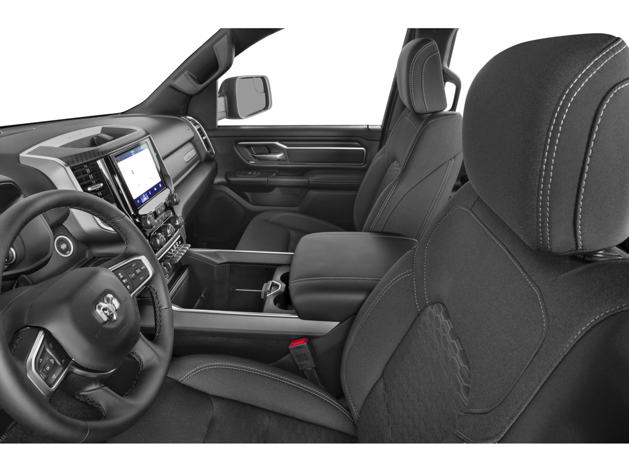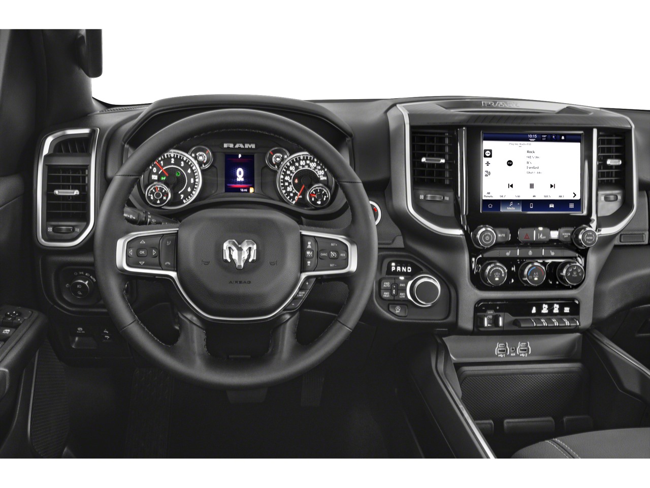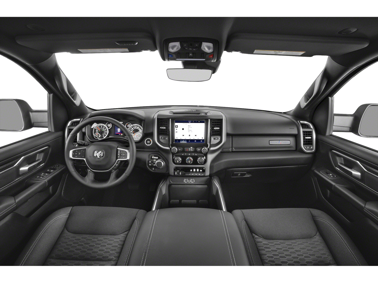 115V Auxiliary Power Outlet, 115V Auxiliary Rear Power Outlet, 12 Touchscreen Display, 2nd Row In Floor Storage Bins, 3 Rear Seat Head Restraints, 4 Way Front Headrests, 4-Wheel Disc Brakes, 400W Inverter, 4G LTE Wi-Fi Hot Spot, 6 Speakers, 9 Amplified Speakers w/Subwoofer, ABS brakes, Air Conditioning, Air Conditioning ATC w/Dual Zone Control, Alloy wheels, AM/FM radio, Apple CarPlay, Apple CarPlay/Android Auto, Auto High-beam Headlights, Auto Power-Folding Mirrors, Auto-Dimming Exterior Driver Mirror, Auto-Dimming Rear-View Mirror, Big Horn Level 2 Equipment Group, Black Exterior Mirrors, Black Premium Power Mirrors, Brake assist, Bumpers: chrome, Cloth Bench Seat, Cluster 7.0 TFT Color Display, Compass, Configurable Drive Mode, Connected Travel & Traffic Services, Connectivity - US/Canada, Convex Wide-Angle Exterior Mirror Insert, Delay-off headlights, Driver door bin, Dual front impact airbags, Dual front side impact airbags, Electronic Stability Control, Exterior Mirrors Courtesy Lamps, Exterior Mirrors w/Heating Element, Exterior Mirrors w/Supplemental Signals, Front anti-roll bar, Front Center Armrest w/Storage, Front fog lights, Front License Plate Bracket, Front reading lights, Front Seat Back Map Pockets, Front wheel independent suspension, Fully automatic headlights, Glove Box Lamp, Google Android Auto, GPS Antenna Input, GPS Navigation, HD Radio, Heated door mirrors, Heated Front Seats, Heated Steering Wheel, Illuminated entry, Integrated Voice Command w/Bluetooth®, Leather Wrapped Steering Wheel, LED Dome Lamp w/On/Off Switch, LED Footwell Lighting, Low tire pressure warning, Manual Adjust 4-Way Front Passenger Seat, Manual Folding Exterior Mirrors, Manufacturer's Statement of Origin, Media Hub w/2 Charge Only USBs, Occupant sensing airbag, Outside temperature display, Overhead airbag, Overhead console, Overhead LED Lamps, Panic alarm, ParkView Rear Back-Up Camera, Passenger door bin, Passenger vanity mirror, Power 2-Way Driver Lumbar Adjust, Power Adjust 8-Way Driver Seat, Power Adjustable Pedals, Power door mirrors, Power steering, Power windows, Premium Overhead Console, Quick Order Package 21Z Big Horn, Radio data system, Radio: Uconnect 5 Nav w/12.0 Display, Radio: Uconnect 5 W w/8.4 Display, RAM Grille Badge - Chrome, Rear 60/40 Folding Seat, Rear anti-roll bar, Rear Power Sliding Window, Rear seat center armrest, Rear step bumper, Rear Window Defroster, Remote keyless entry, Remote Tailgate Release, Security Alarm, SiriusXM w/360L, Speed control, Split folding rear seat, Steering Wheel Mounted Audio Controls, Sun Visors w/Illuminated Vanity Mirrors, Supplier Part Tracking (J-1), Tachometer, Telescoping steering wheel, Tilt steering wheel, Traction control, Trip computer, Universal Garage Door Opener, USB Host Flip, Variably intermittent wipers, Voltmeter, Wheels: 18 x 8 Cast-Aluminum Painted, BACK UP CAMERA,